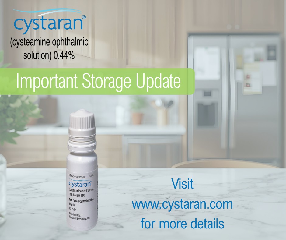 Leadiant Biosciences, Inc., is pleased to share an important update regarding CYSTARAN® (cysteamine ophthalmic solution) 0.44%. Beginning December 22, 2025, shipments of CYSTARAN received through Walgreens Specialty Pharmacy must be stored in the refrigerator upon delivery. Do NOT freeze the medication.